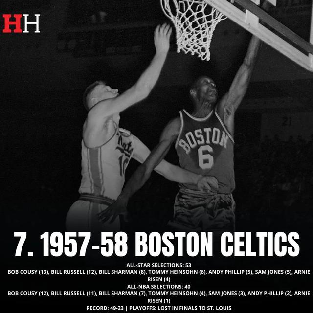 选择最佳阵容 40 第二:鲍勃库西 ( 12 ) 、比尔拉塞尔 ( 11 ) 、比尔沙曼 ( 7 ) 、汤米海因森 ( 4 ) 、萨姆琼斯 ( 3 ) 、安迪菲利浦 ( 2 ) 、艾尔尼瑞森 ( 1 )
