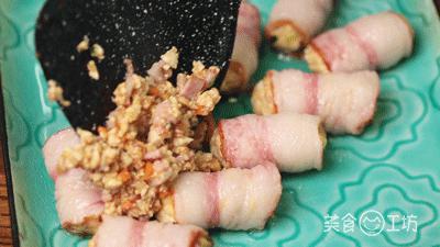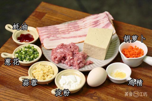 肉沫 100g/ 老豆腐 100g/ 培根 6 片 / 鸡蛋 1 个