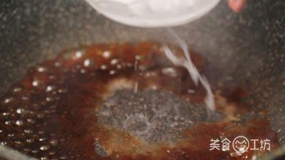9. 锅内加入少许油、酱油、糖、盐,调成汁儿,然后倒入适量淀粉水勾芡,倒入双喜爆竹。