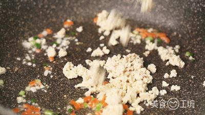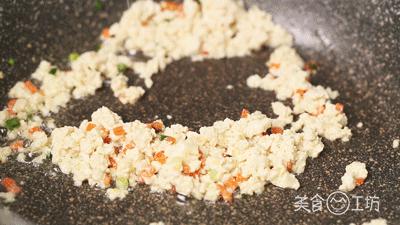 7. 此时,又开了一锅,加入葱蒜末和胡萝卜粒子爆香,再加入剩下的豆腐碎和切碎的培根丁,翻炒变色。