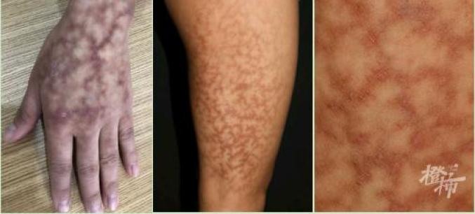 近日,70出头的李阿姨来到浙江某医院皮肤科诊所。就在几天前,她偶然发现自己的手和腿上有一个大大的网状黑红图案,就像蟒蛇图案一样,无法摆脱。李阿姨来医院是因为怕自己得了什么大病。