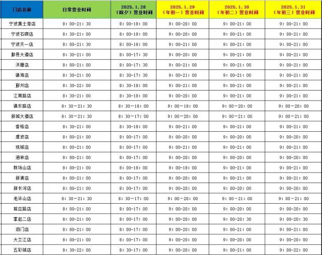 1 月 29 日(正月初一)到 1 月 31 部分店铺的营业时间(正月初三)调整到 10:00-20:00