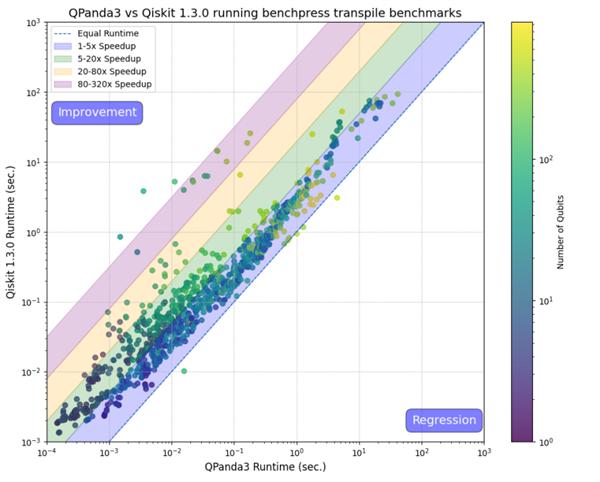 根据 Benchpress QPanda3检测结果 量子线编译性能明显优于量子线编译 Qiskit 1.3.0。QPanda3 在不同的前提下,编译速度提高了 1 到 320 特别是在处理大规模量子线路时,倍的表现尤为明显。