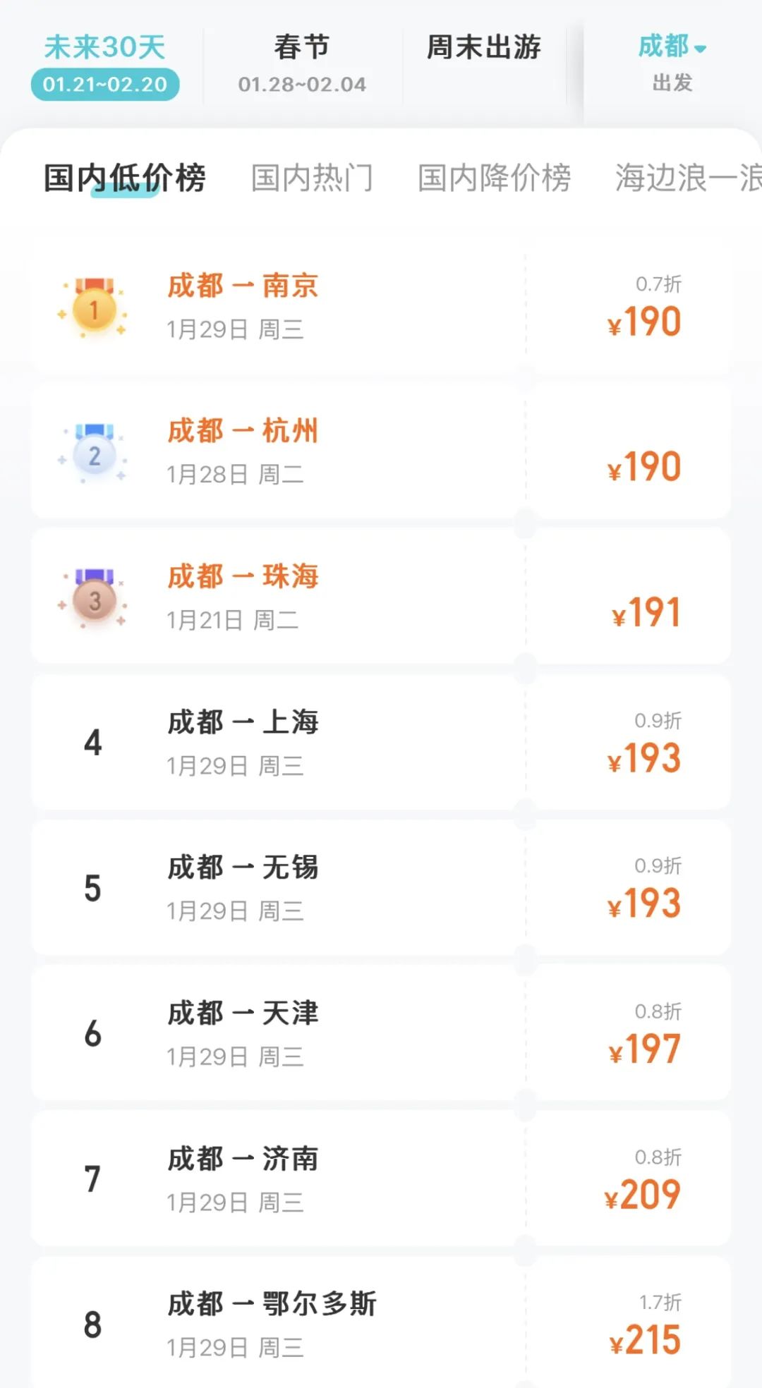 就低价机票而言,春节假期期间,成都飞往南京、杭州、珠海、上海等地不到200元。
