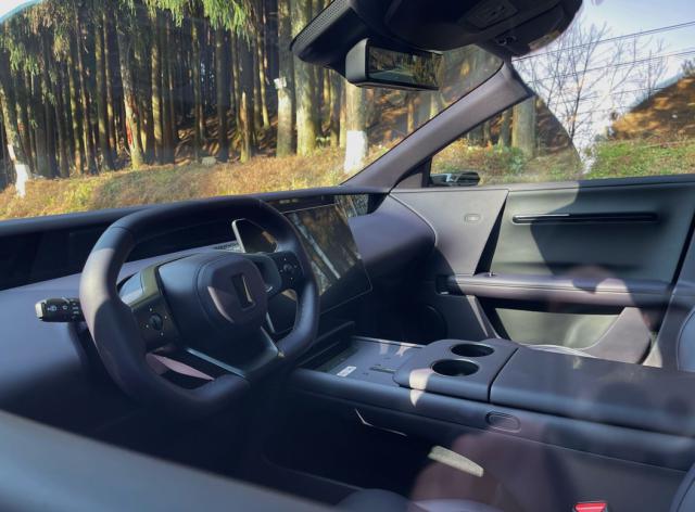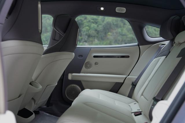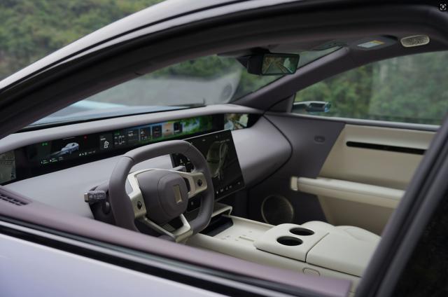 进入车内,驾驶室配有扁平的三辐多功能方向盘,组合有挡换挡机构;液晶仪表和副驾驶屏幕采用一体式远端“带鱼屏”,可以提供视觉和互动体验。一个大中控面板斜躺在扶手箱上方,整个前舱没有物理按钮,看起来相对简单;而且前舱挡风玻璃的顶部配有流媒体后视镜,扶手箱区有两个无线充电装置。