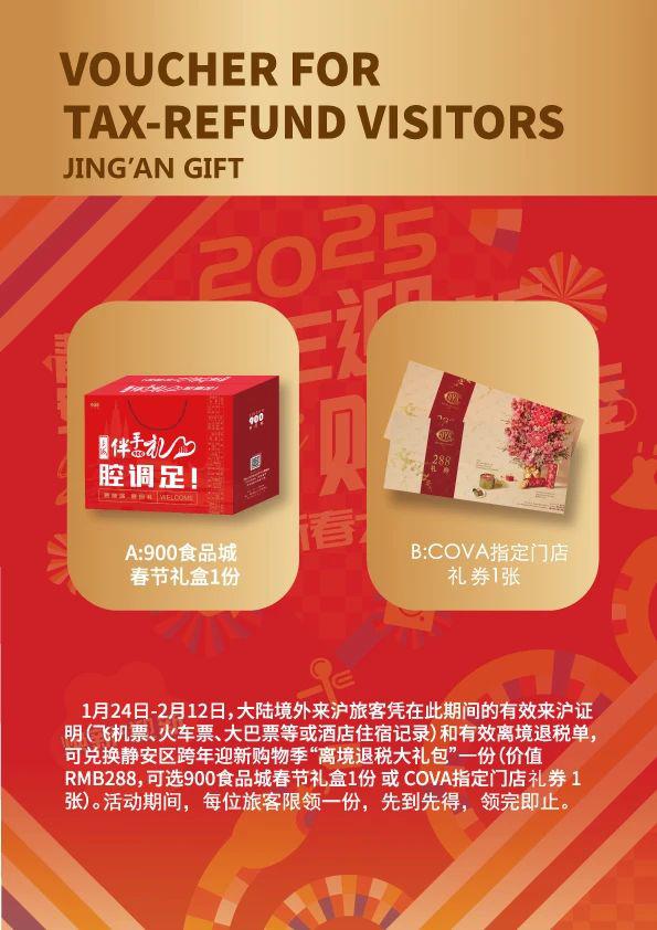 1 月 24 日— 2 月 12 当天,大陆海外来沪旅客(机票、火车票、公交车票等。或酒店住宿记录)和有效的离境退税单可在静安区跨年购物季兑换“静安礼品-离境退税专属礼包”(价值 288 元,900 美食城春节礼盒 1 份或 COVA 指定商店礼券 1 张)。活动期间,每位旅客限领一份,名额有限,领完为止。