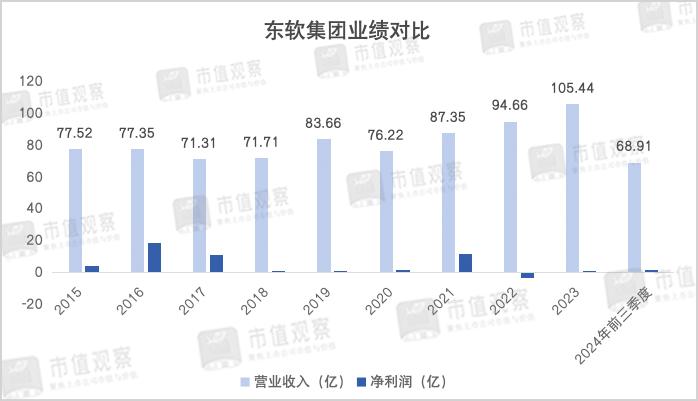 就营业收入而言,东软集团仍保持着增长的步伐,2015-2023年间从77.52亿增长到105.44亿,2024年前三季度持续增长10.03%至68.91亿。表明近几年的业务扩张有了一定的效果。