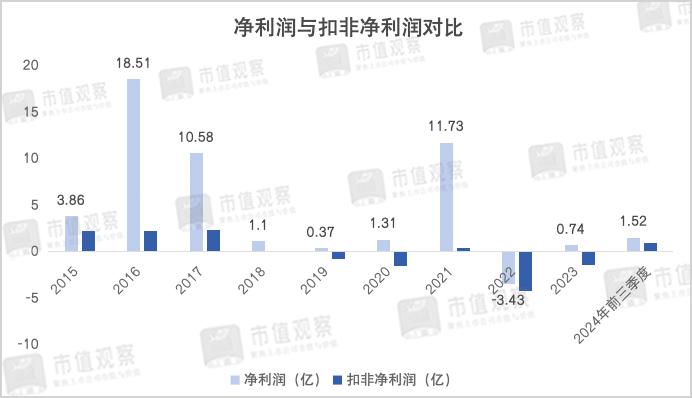 扣除非净利润的表现更加惨淡,2018-2023年,除2021年实现0.35亿正收益外,其它年份均出现亏损。尽管2024年前三季度转正至0.95亿,但规模仍不大。