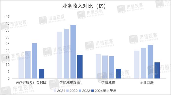 在财务报告中,智能汽车互联网在东软集团四大主营业务中收益最高,2024年上半年同比增长7.31%至17.3亿元,但随着竞争的加剧,业务毛利率逐渐下降,早在2021年,毛利率就达到了20.88%,到2024年上半年,已降至16.22%,自2022年以来,四大业务毛利率最低,业务收入增速已进入个位。