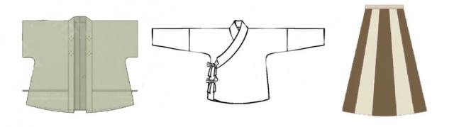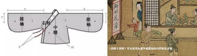 "交领右衽"即领口与衣服相连,衣服在胸前交叉,在外观上呈现" y “字形。交领衣服上常见的中间缝,中间缝代表中间缝,是儒家的美好愿望。在《清明上河图》中,男女老少最常见的款式是交领,也可以证明交领是人民的主流服装。