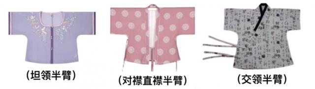 这种半臂款式在历代都很流行,可以是对领也可以是坦领。方领在明朝曾经很流行。半臂长度不固定,交领和对领是最常见的款式,而坦领主要在唐代流行。