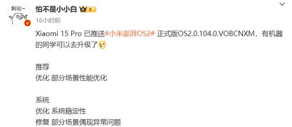 【CNMO 技术新闻】近日,小米和红米为各种手机推送澎湃。 OS 更新。小米 15 Pro 正式版本的澎湃迎来了 OS2.0.104.0.VOBCNXM 更新,设备持有人可以去检查更新。这次更新改善了一些特定场景下的性能,提高了系统的整体稳定性,修复了一些之前偶尔出现的异常问题。
