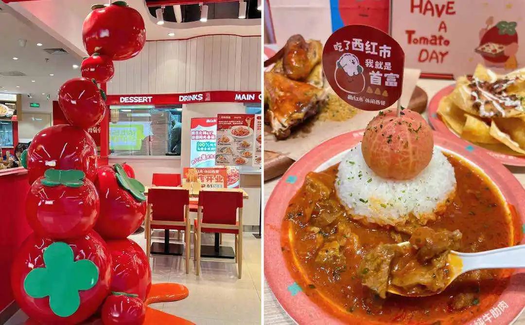 西红市的门店大多位于商场的B1楼,充分利用了购物中心的高人流量。店内大西红柿的装饰特别抢眼,吸引了很多顾客停留拍照,营造出店内休闲的氛围。在外卖平台上,西红市的一份面食招牌单人餐团购价格低至9.9元,进一步增加了其性价比优势。