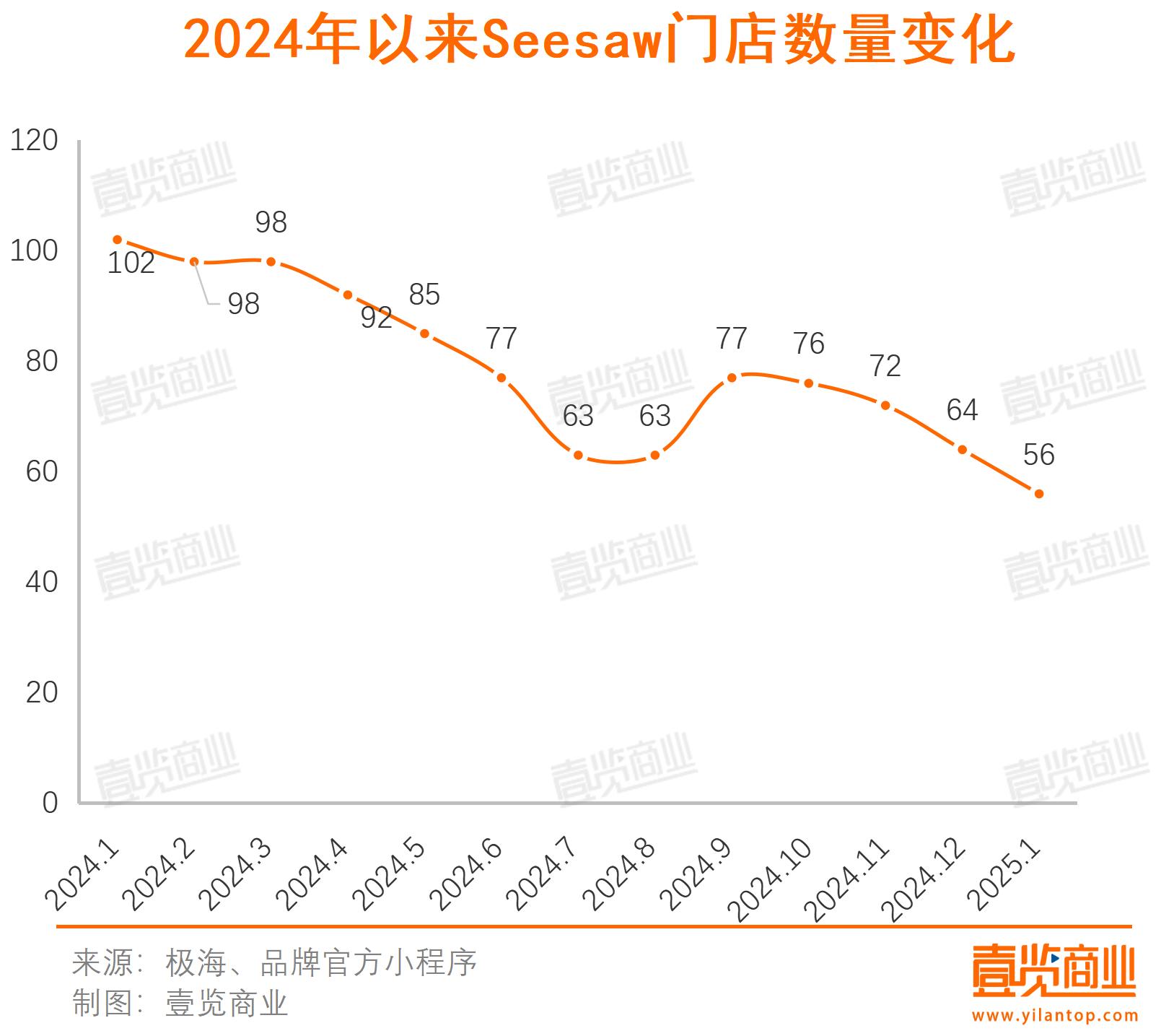 根据一览商业此前的统计,2024年1月,Seesaw的门店存量为102家,而现在,这一数字已经变成了56家。根据窄门餐眼数据,2024年,Seesaw共开设了26家门店。也就是说,自2024年以来,Seesaw已经关闭了至少72家门店。