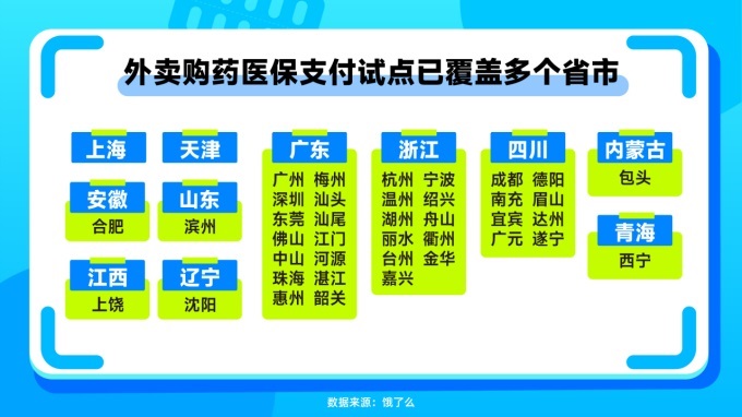 据悉,上海、杭州、广州、深圳、成都、合肥、沈阳等一二线城市。,以及青海、内蒙古等偏远省份,目前已在饿了么上开展医疗保险购药网上支付试点。几乎所有在线城市都实现了主城的全覆盖。2024年,各地试点推进的实施速度正在加快。