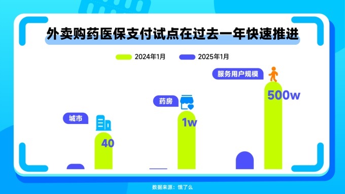 饿了么数据显示,在过去的一年里,支持医疗保险购药支付的平台上的6个城市从2024年初增加到40多个,平台接入的试点药店数量达到近万家,同比增长近10倍,年服务用户数量近500人。