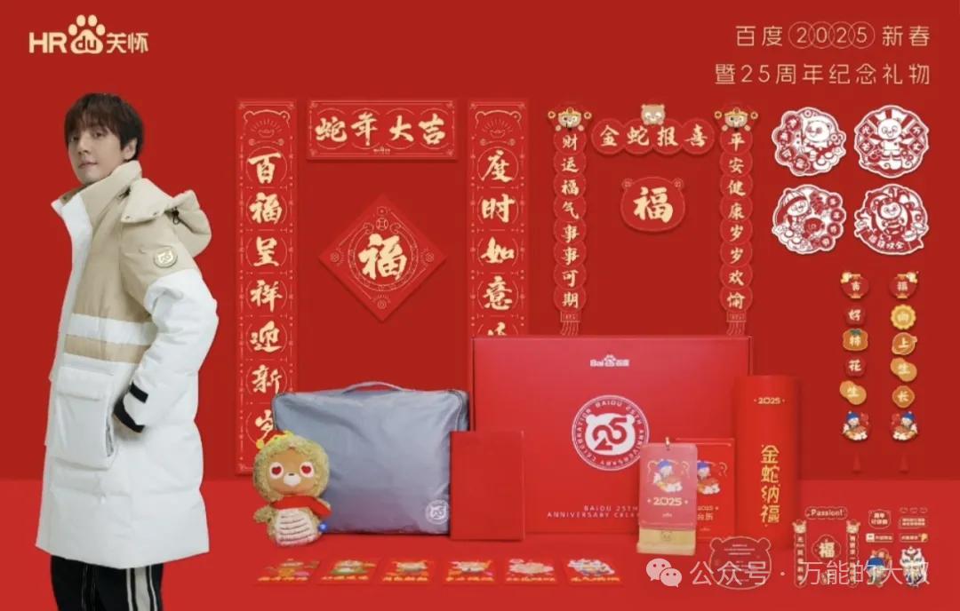 百度更“豪”。25周年和波司登联名羽绒服,四种颜色都可以选择,蓬松温暖。当你穿着制服出门时,你会穿上温暖和爱。蛇年毛绒小熊,2025笔记本,大大小小的春联福字,红包,窗花,饰品,年味十足!