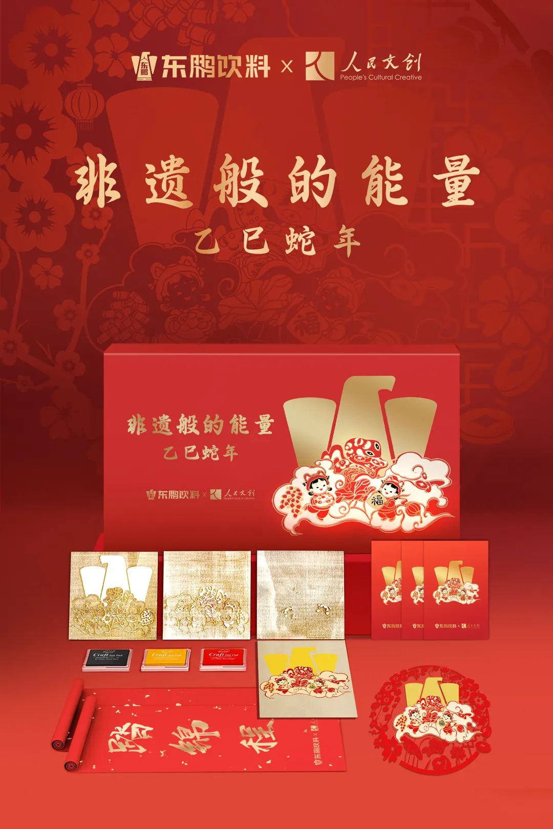 木版年画作为一种传统的中国民间艺术方式,有着几千年的悠久历史,寄托着人们对美好生活的追求和向往。董鹏饮料与人民文化创作、佛山木版年画解忧年画铺合作,推出“非物质文化遗产能量第二蛇年”春节礼盒,希望以这种形式让非物质文化遗产焕发新的能量。