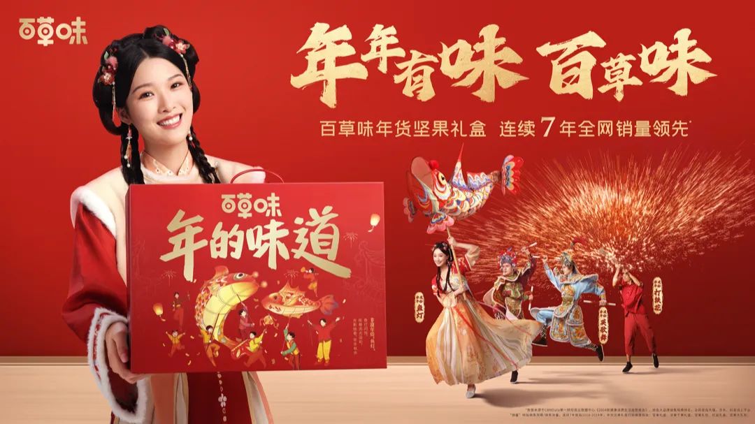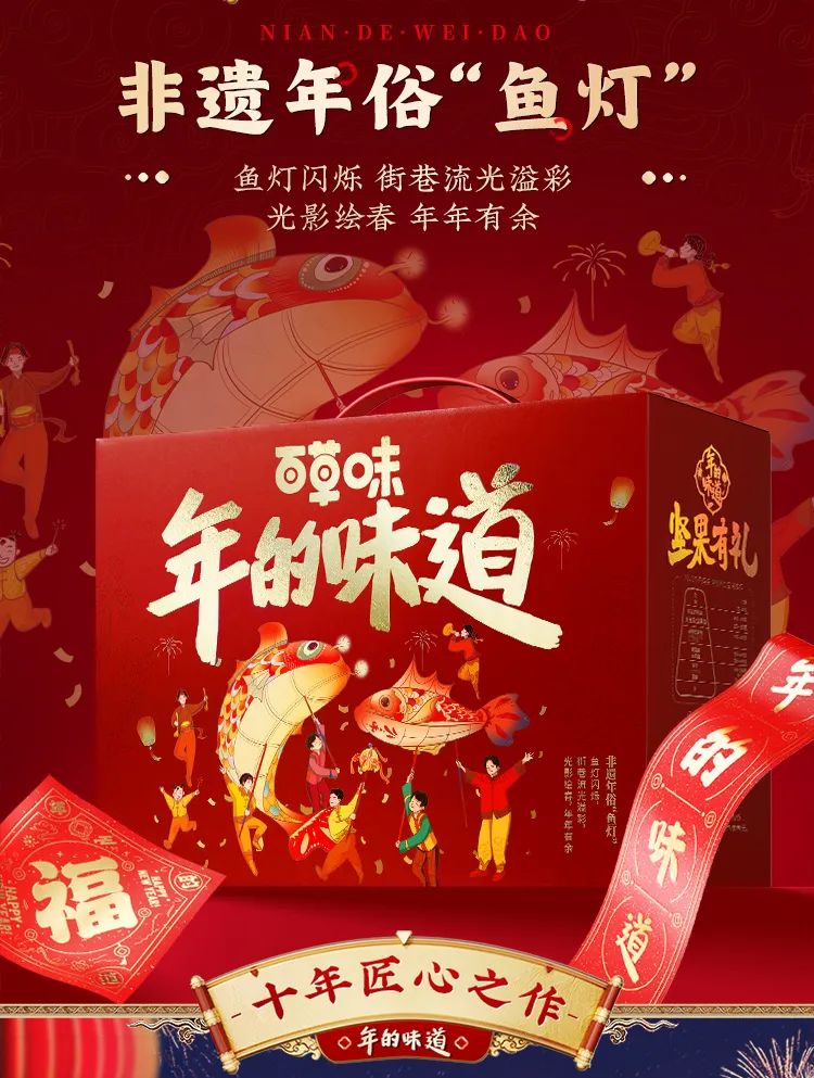 据说百草风味全品牌年货坚果礼盒累计超过1亿盒!今年的春节礼盒,在礼盒造型上,包装了非物质文化遗产的习俗。同时,百草风味还与永乐宫IP、其它国风IP合作,如自然造物IP,为礼盒包装带来优雅的国风优雅。