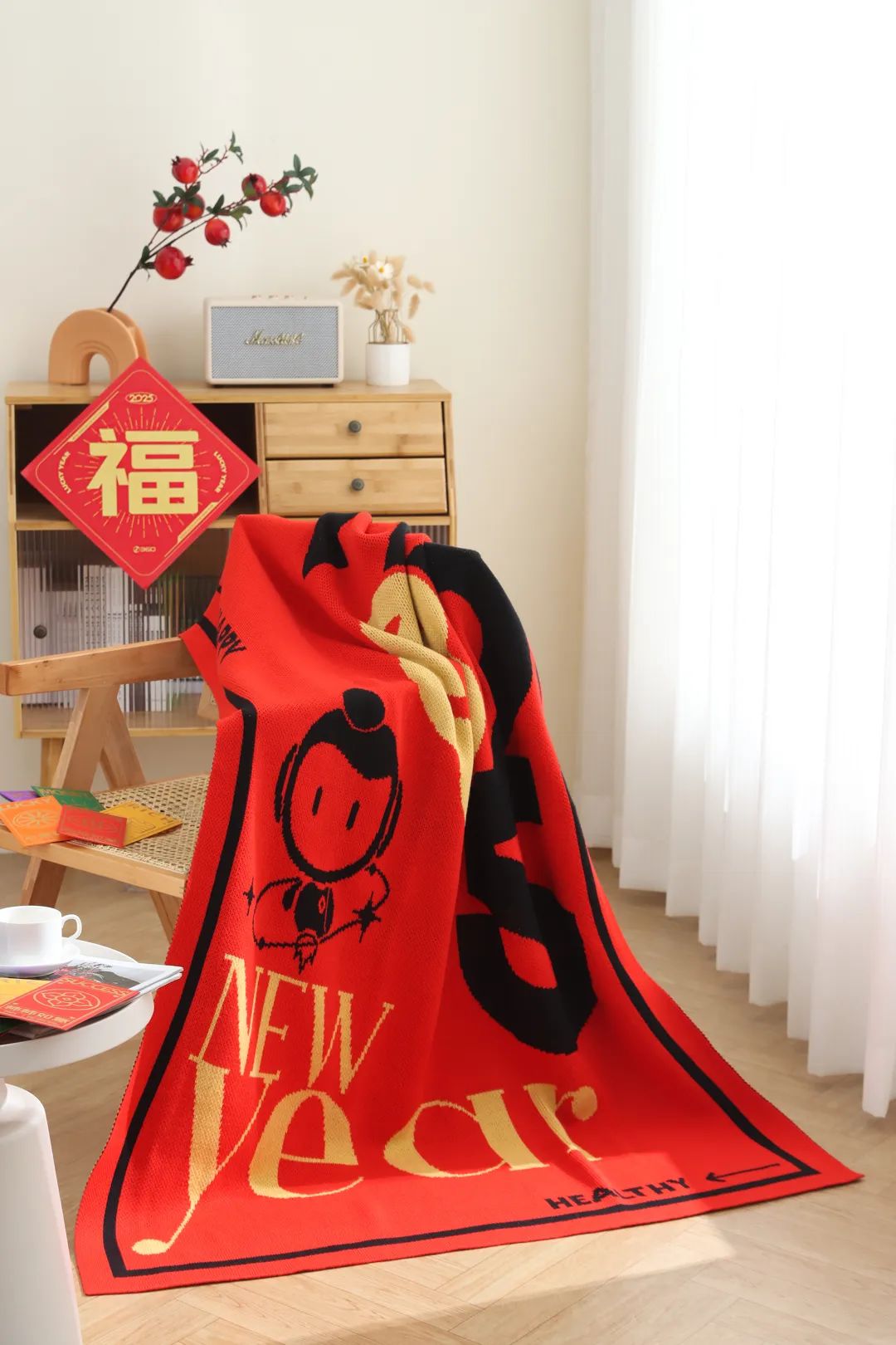 打开盒子后,你会发现还有四个副标题:「开盒好运」相应的旋转冰箱贴纸;「蓄势蓄力」相应的充电套装和周总新书;「AI满新年」春联红包套装由AI产生;最后一套「温暖四季」这是一条鲜红的针织毛毯!