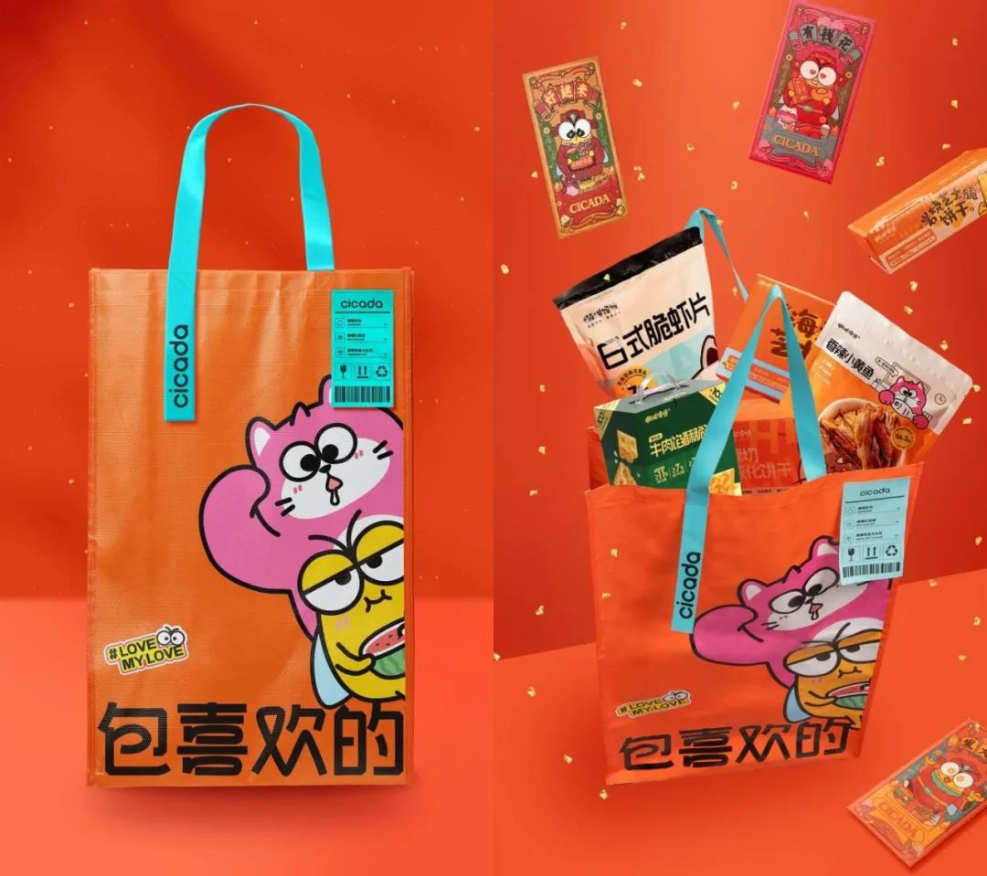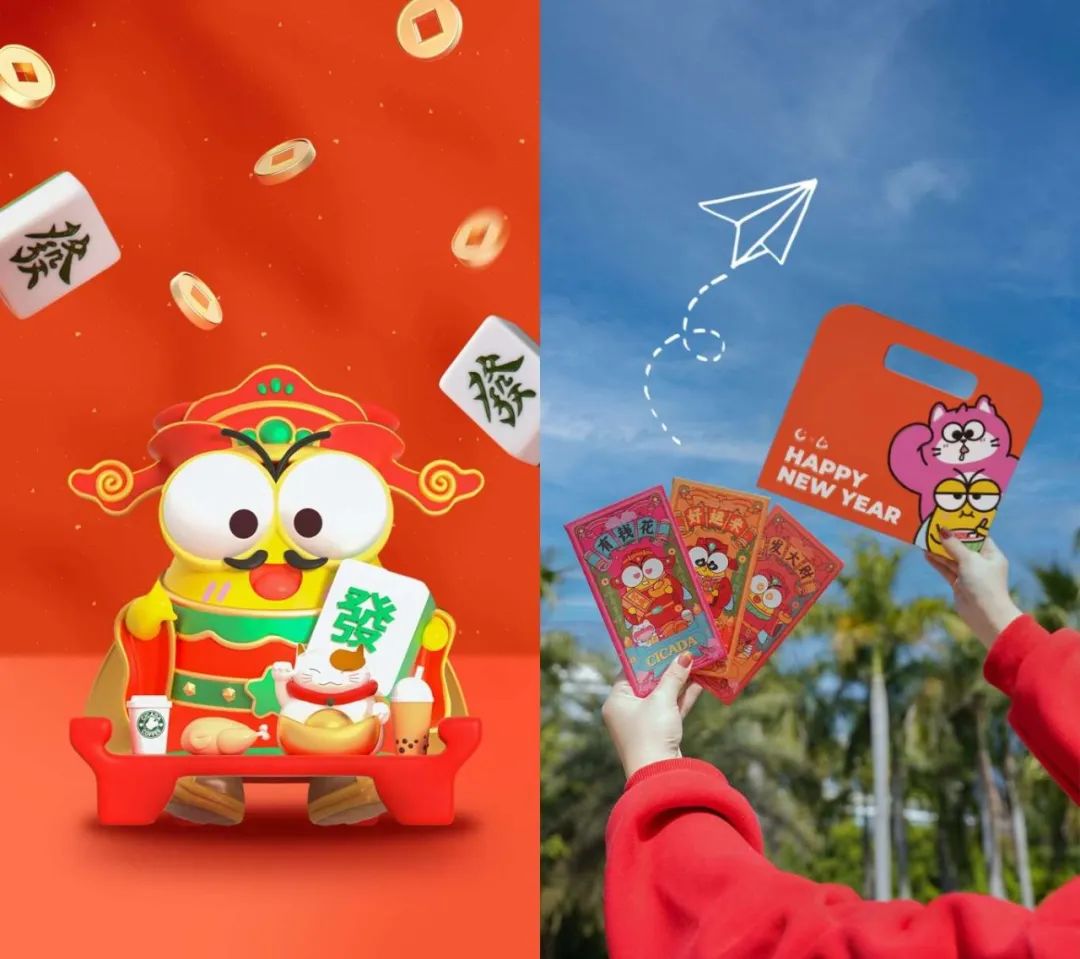 这一次,蝉师傅用了大胆的配色和夸张的尺寸,非常BAG,很酷!让蝉承包你的新年小吃!懒猫贪吃的全线小吃礼包+蝉镜AI礼品卡,好吃又好玩!还有第一次推出的财神手工制作。小桌子上有蝉咖啡、烤鸡、元宝猫和奶茶,可爱又开心!
