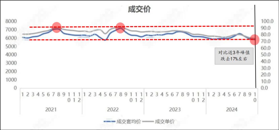 因为是近四年的租金走势,第一眼你几乎看不到租金下降。但是,只要我们仔细检查,就会发现2024年10月明显低于去年同期。与2021年市场租金下降相比,大约是16.9%,而且现在也是近三年来市场低点。