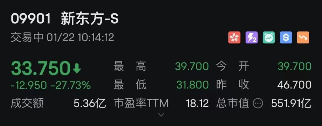 新东方股票低开后,跌幅一度扩大到30%,截至发稿时仍下跌27.73%,东方选盘初跌6%以上。