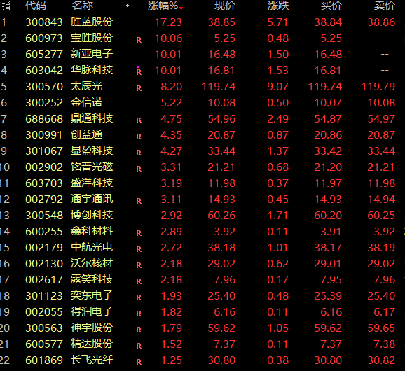铜缆高速连接板块直线上涨,新亚电子、华脉科技日线涨停,胜蓝股份涨幅超过10%,瑞可达、新科材料、金信诺、兆龙互连、神宇股份等。