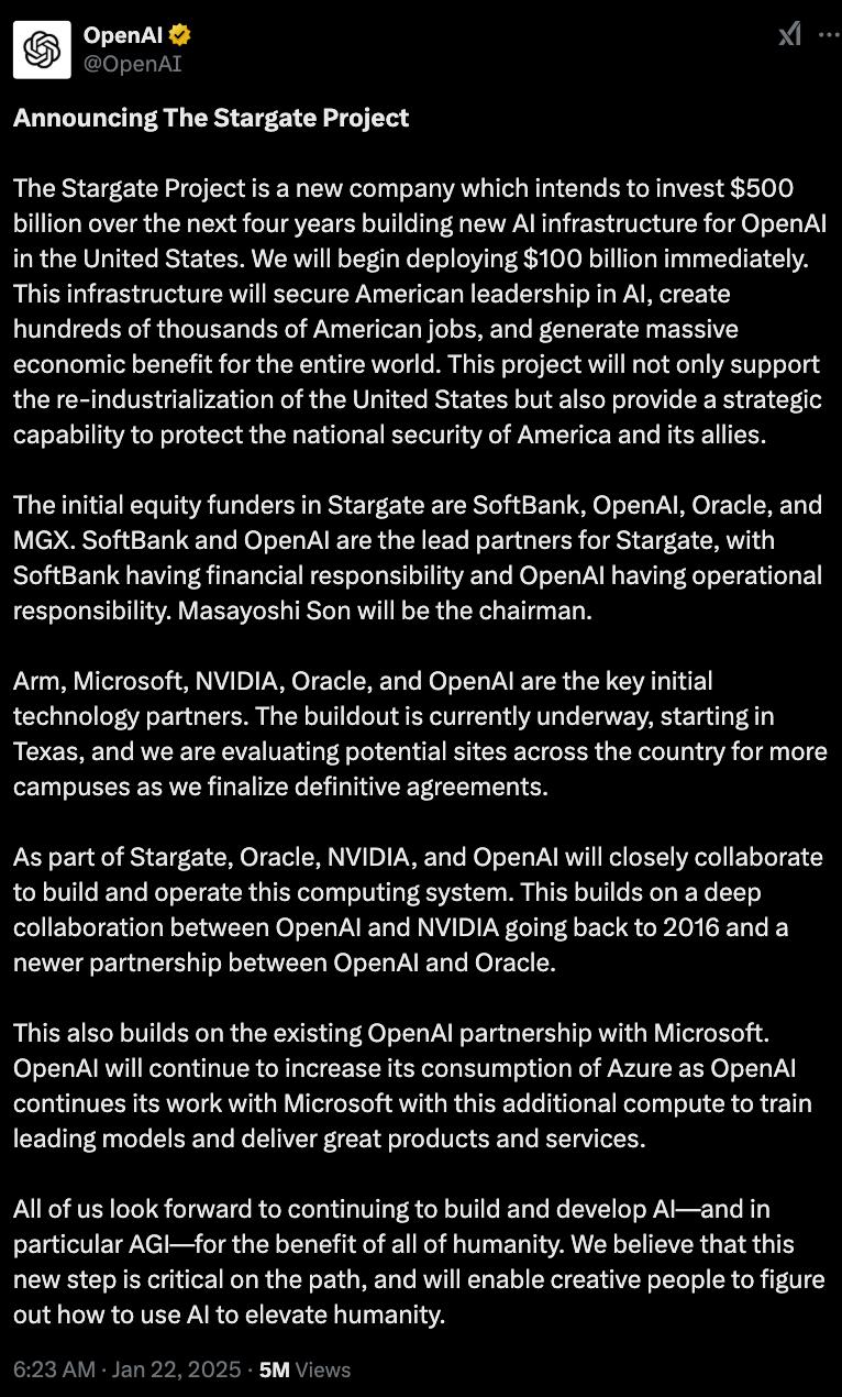OpenAI还在公告中指出,这个项目将创造10万个高质量的就业机会,并且表示这将是这个时代最伟大的项目。