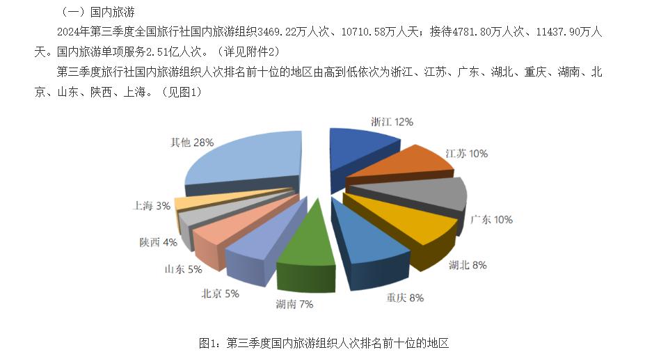 根据文化旅游部《2024年第三季度全国旅行社统计调查报告》,2024年第三季度全国旅行社国内旅游组织人数为3469.22人,下降38%,但国内旅游单项服务人数为2.51亿,上升26.7%。