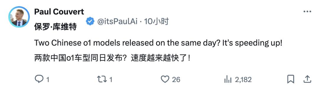 现在,海外同行的反馈主要是兴奋。比如保罗·库弗特,Answera公司的创始人。(Paul Couvert)感觉,两个中国o1同日发布,(中国AI)追逐速度越来越快!