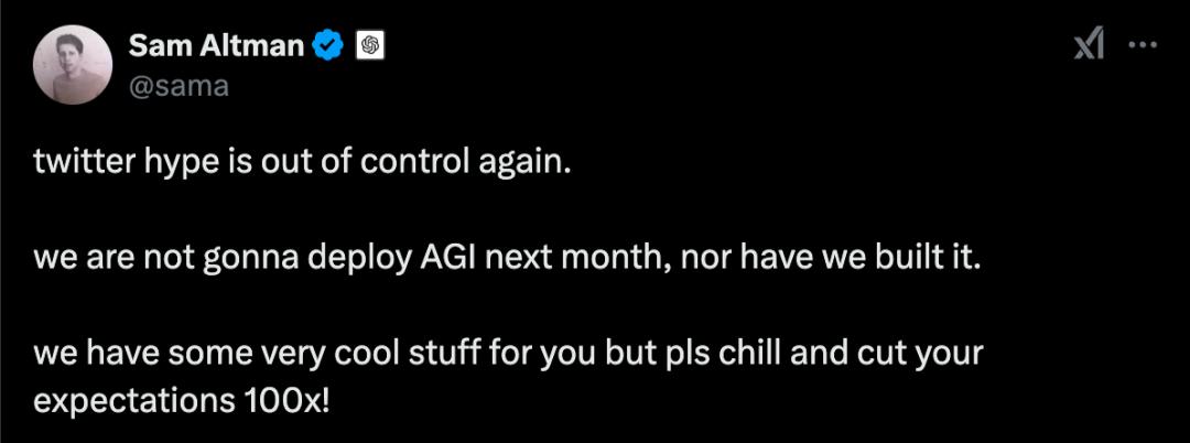 OpenAI 在社交媒体上,CEO奥特曼说:twitter hype is out of control"(推特上的各种炒作已失控)。“AI将取代大多数中层职位”(主要依靠推理模式),他认为外界猜测过于夸张。但愿每个人都能冷静下来,把期望降低100倍(cut your expectations 100x)。