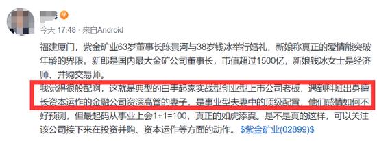 巧合的是,有时候大老板既开公司又开矿。比如紫金矿业的老板陈景河,娶了一个做过期货交易并购的金融圈老婆。