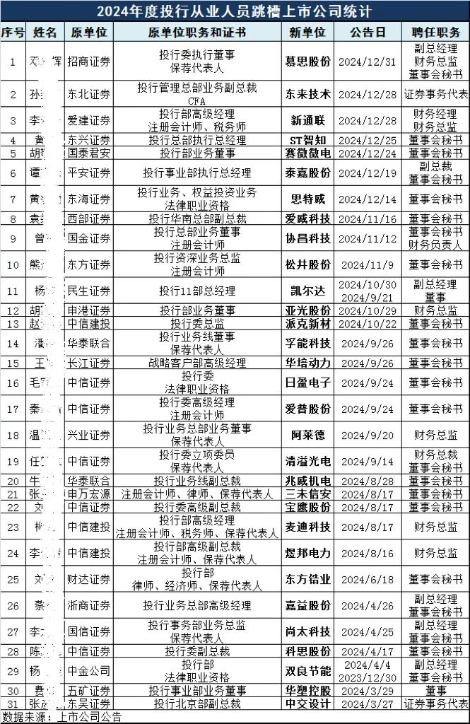 最近,一份表格传遍了金融界,统计了2024年投资银行从业人员跳槽上市公司的情况。