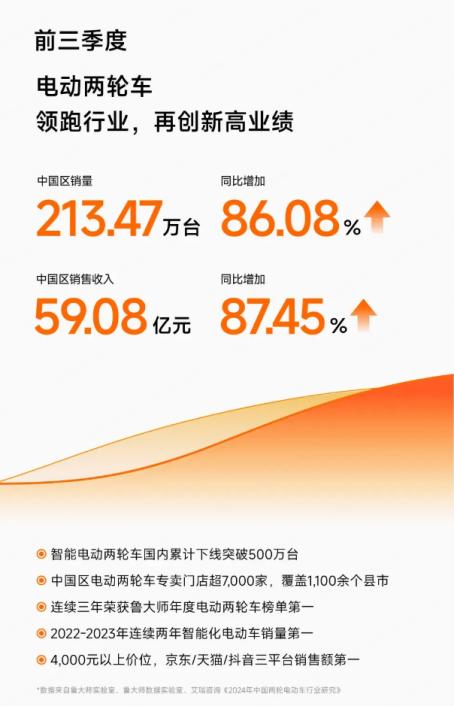 以目前智能水平位居前列的九号公司为例。自进入两轮电动汽车市场以来,以“智能化、品牌化、年轻化”为产品战略定位,赢得了市场的快速认可,这也给九号带来了快速的业绩提升。据官方资料显示,2024年9号两轮电动汽车业务收入持续增长,Q3中国区销售额达213.47万辆,同比增长86.08%;与此同时,中国区的销售收入也实现了59.08亿元的同步增长,同比增长87.45%。