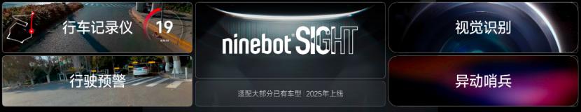 NinebotSIGHT是一个AI视觉辅助系统,它配备了三个集成的高性能AI芯片摄像头模块,它具有视觉预警功能,包括前向碰撞预警(FCW)、盲区监测(BSD)、车道偏离警告(LCW)预警后向碰撞(RCW)等。