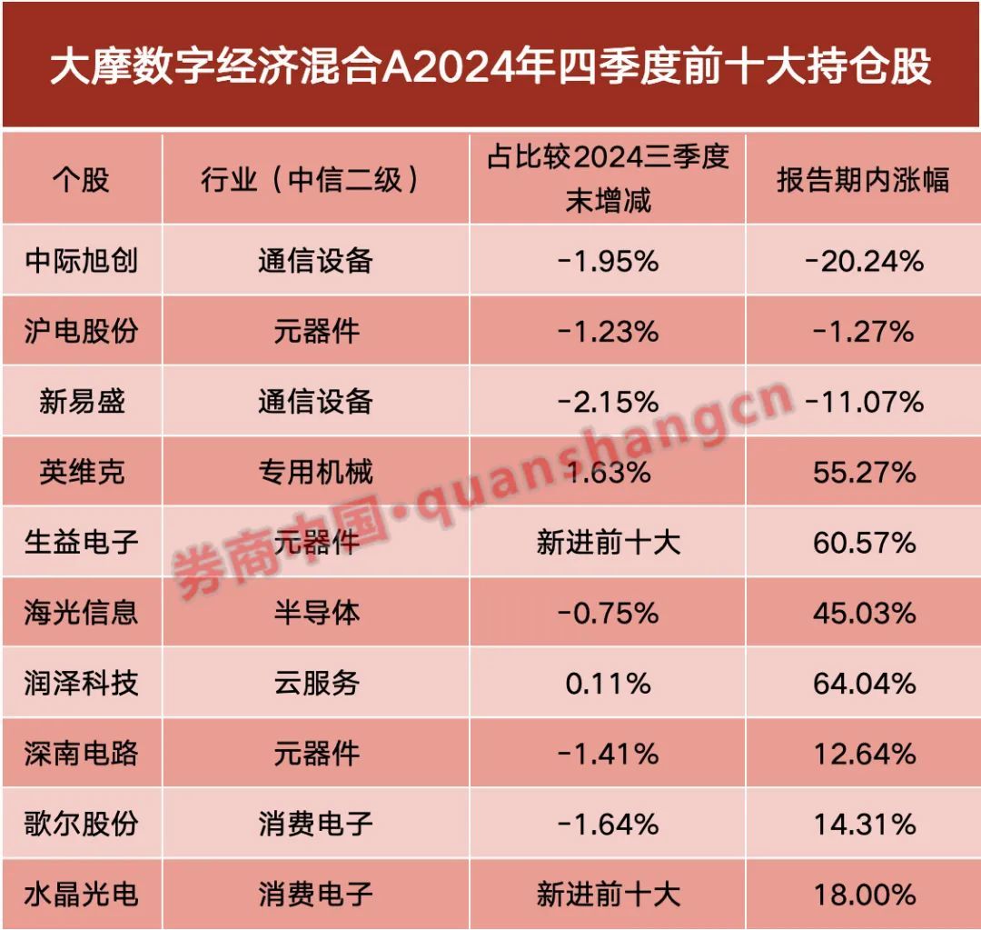 近日,大摩数字经济混合A因重仓人工智能获得2024年度公募基金冠军,最新披露2024年第四季度持股变动。从调仓动作来看,第二季度末现有重仓股有八大重仓股,天孚通信、工业富联被调出前十大重仓股。