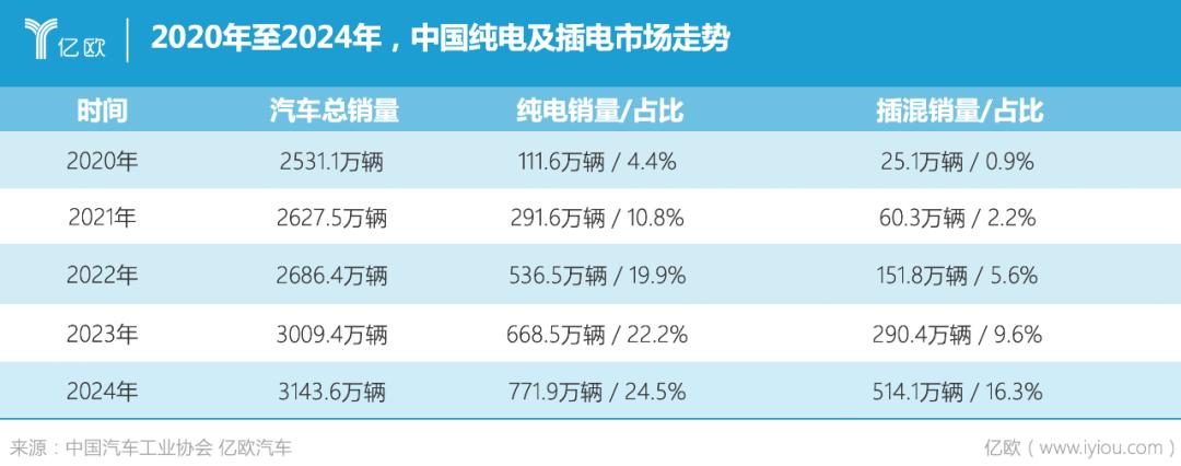 问题是,整个纯电力市场的增长明显放缓,渗透率的增长几乎停滞不前。根据中国汽车工业协会的数据,2023年,中国汽车总销量和纯电动汽车销量分别为3009.4万辆和668.5万辆,纯电动汽车销量分别为22.2%。;到2024年,以上三项指标分别为3143.6万台,771.9万辆,24.5%,增长不明显。