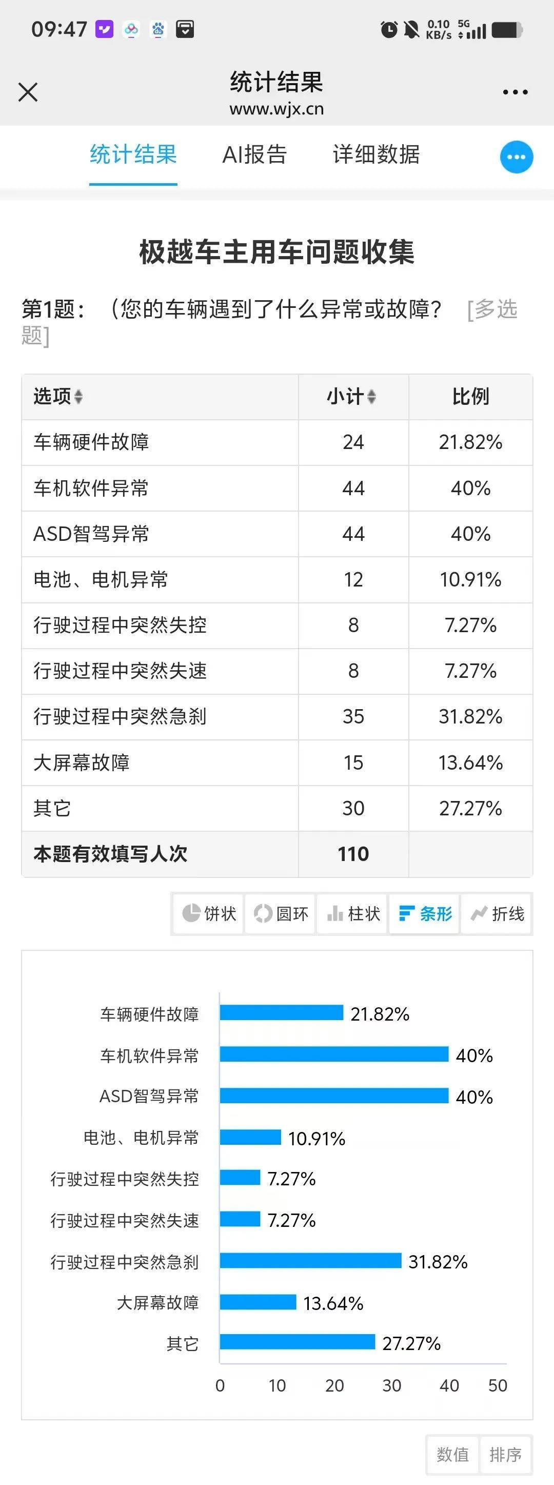 针对目前骑手遇到的问题,张先生在骑手群中做了一项调查,获得了110名车主的反馈信息。调查数据显示,车主遇到的问题最多的是车机软件异常和ASD智能驾驶异常,占比40%。其次,突然刹车在行驶过程中也比较突出,占31%以上。。另外,车辆硬件问题,大屏幕故障,电池电机异常,当前车主在行驶过程中突然颤抖或失控也是一个问题。