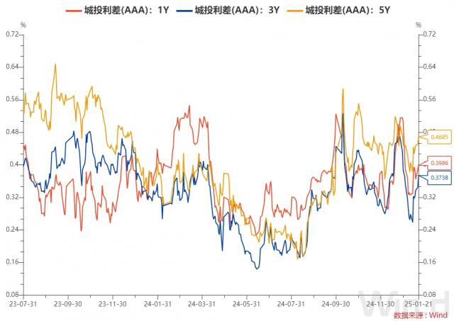 5. 最近城投债(AAA)每个期限的利差走势和数据。