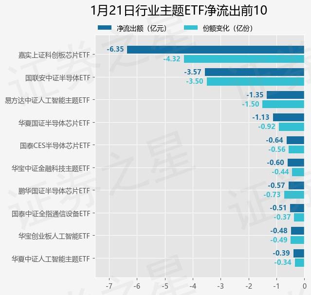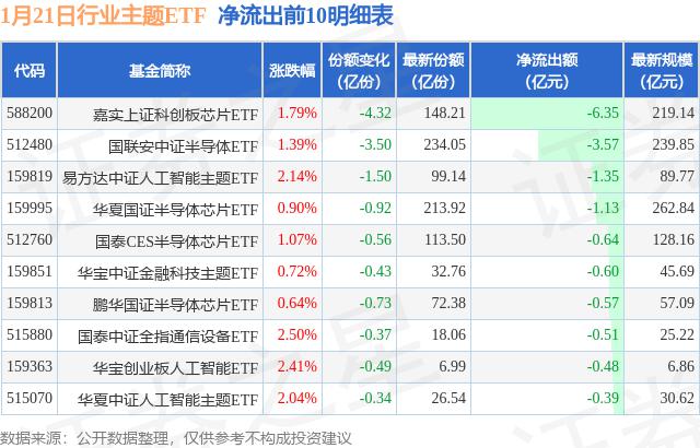 当天有 163 只行业主题 ETF 资金净流出,其中嘉实上证科技创新板芯片净流出排名第一。 ETF(588200),份额下降 4.32 一亿份,净流出额为 6.35 亿元。