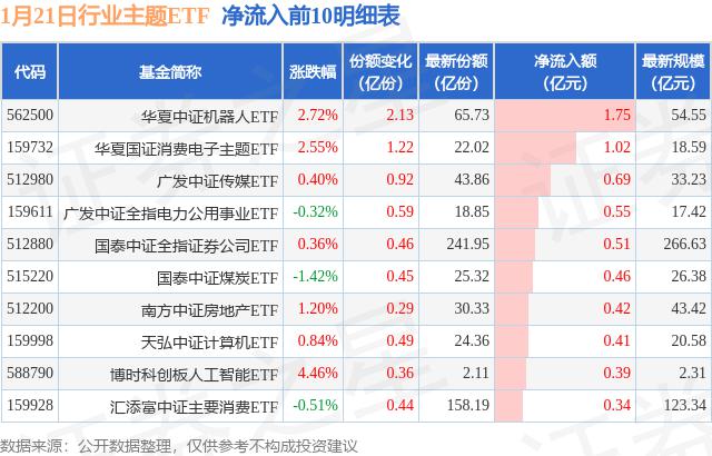 当天有 85 只行业主题 ETF 资金净流入显示,其中华夏中证机器人净流入排名第一。 ETF(562500),份额增加 2.13 十亿份,净流入额为 1.75 亿元。