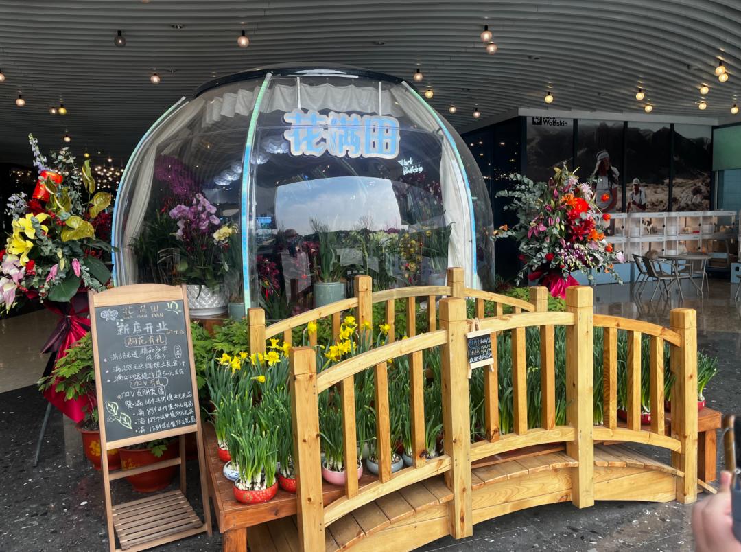 过年的时候,花满田把店搬到了春节,营造了一个温暖的花香世界。在商店里,各种各样的花朵盛开,吸引了许多居民留下来选择。店外,商家还搭建了“高价值”的创意花卉架构,打扮成赏心悦目的“年味”。