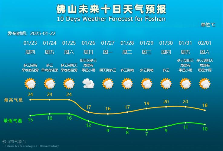 根据佛山市气象局的估计,1月26日佛山市最高气温将比25日明显下降7℃;26日至29日,最低气温持续下降,年初一(29日)上午最低气温降至7℃。展望除夕至年初二(28日至30日),最高气温轻微升高,日温差增大;受晴空辐射降温影响,最低气温低迷,早晚严寒。(来源:佛山市气象局)