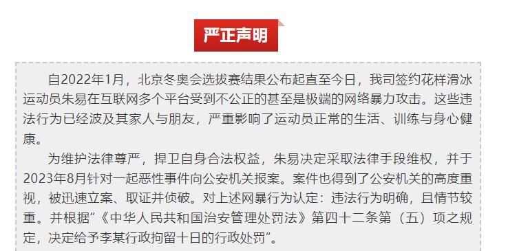 朱易决定通过法律手段维权,并于2023年8月向公安机关报案。公安机关认定上述网络暴力行为:违法行为明确,情节偏重,决定对李某行政拘留10天进行行政处罚。