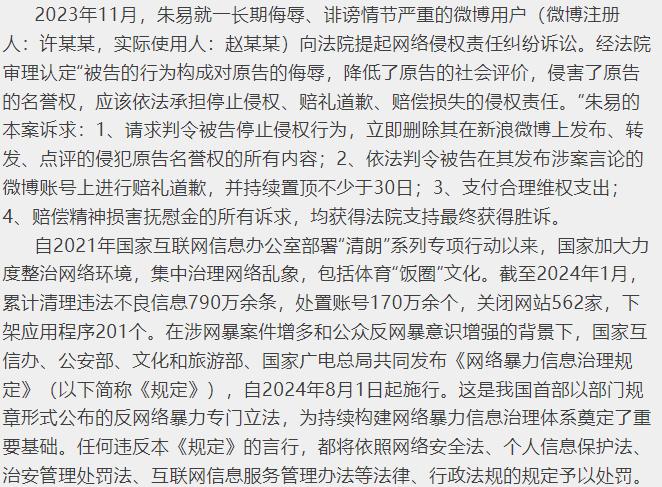 2023年11月,朱易向法院提起网络侵权责任纠纷诉讼,对微博用户(微博注册人:许某某、实际应用人:赵某某)进行了长期侮辱和严重诽谤。