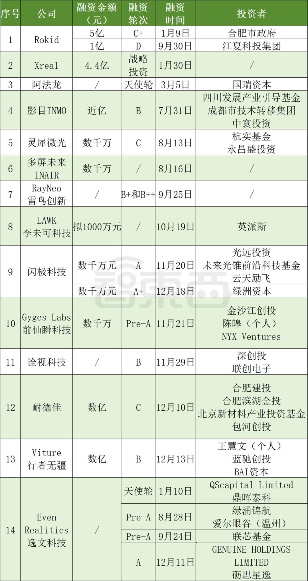 总体而言,Rokid和XREAL各自拉至5亿元、4亿元的每笔融资,投资后估值均超过100亿元;影目INMO、雷鸟创新,闪极科技,Gyges Labs、无疆和EveneViture行者 Realities逸文科技,先后将国有资产、知名风险投资机构和资深业内人士的投资拉到了一边。