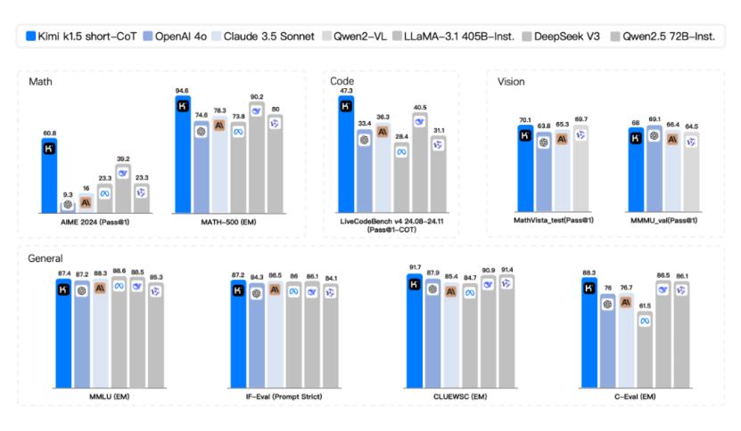 具体来说,在short中-CoT(短期思考)模式,Kimi k1.5超越所有其他模型。它的数学、代码、视觉多模式和通用能力大大超越了SOTA模型在全球范围内的短期思维 GPT-4o和Claude 3.5 Sonnet的水平领先550%。
