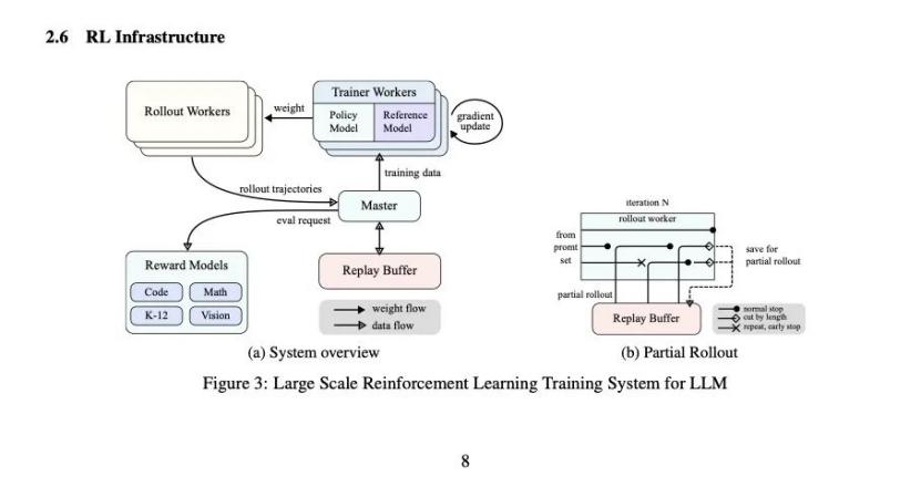 为适应强化学习训练,Kimi k1.为了支持整个训练系统,专门设计了一个特殊的强化学习框架。