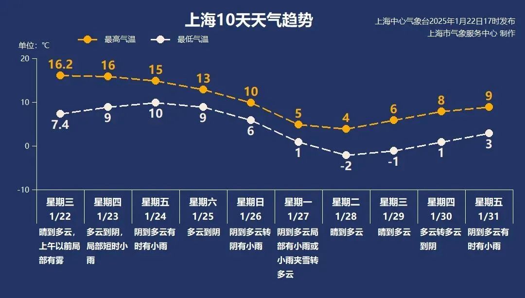 节前大风大雪,但降温持续时间较长。除夕夜和元旦上海天气晴朗寒冷,城市早晚最低气温在零下2℃,郊区较低。白天最高气温只有4~6℃左右。从年初二开始,云系增加,气温略有上升。